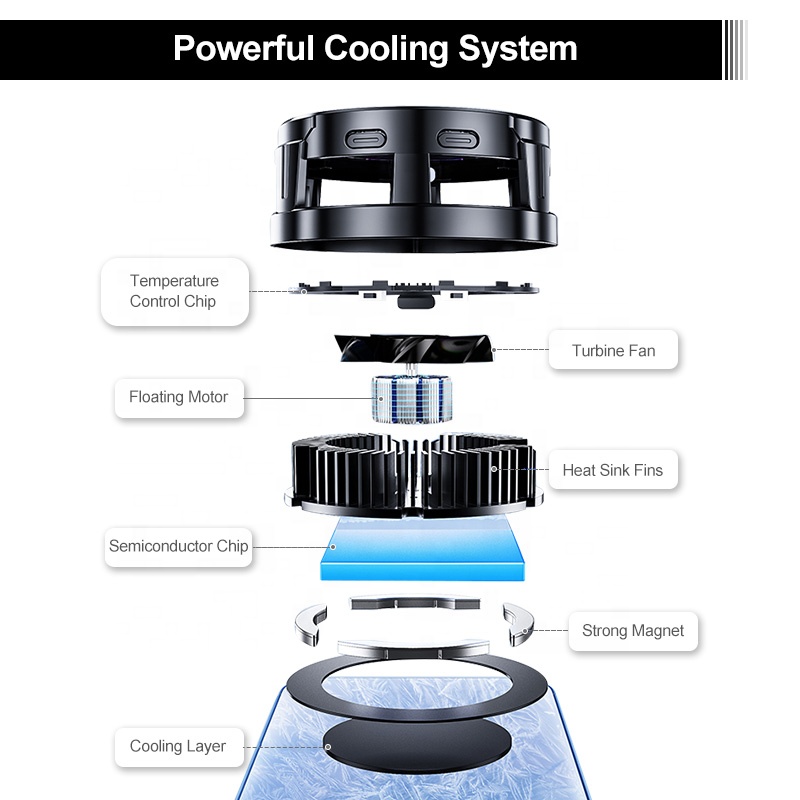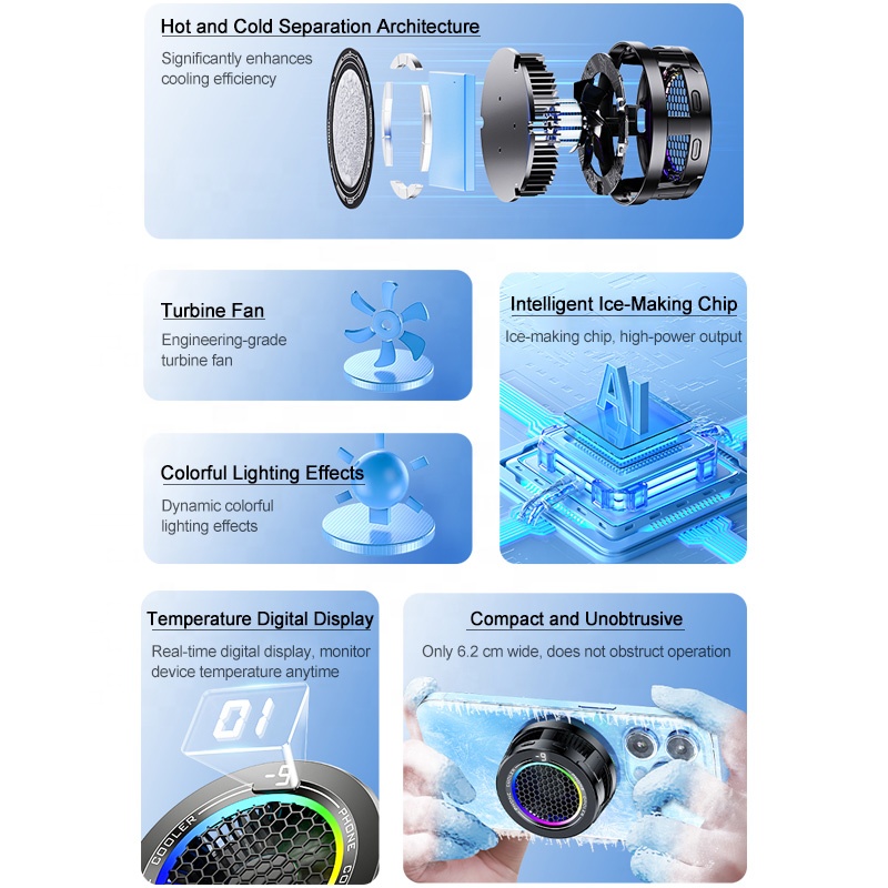 نمایشگر دمای دیجیتال، نورپردازی جذاب RGB، افکت های نوری متعدد و طراحی چشم نواز از مهمترین قابلیت های ظاهری این محصول خنک کننده می‌باشد. از آنجا که پره های قدرتمند این محصول با سرعت بالا کار می‌کنند، به خاطر عملکرد رادیاتوری، بخشی از گرما از طریق بخار آب از روی بدنه گوشی تلف می‌شود. از طرفی، به خاطر وجود تراشه های TEC هیت سینک، فلز تعبیه شده روی خنک کننده که دقیقا در محل اتصال گوشی با محصول قرار می‌گیرد، به سرعت شروع به سرد شدن می کند تا از این طریق نیز گرما از گوشی یا تبلت دور شود.